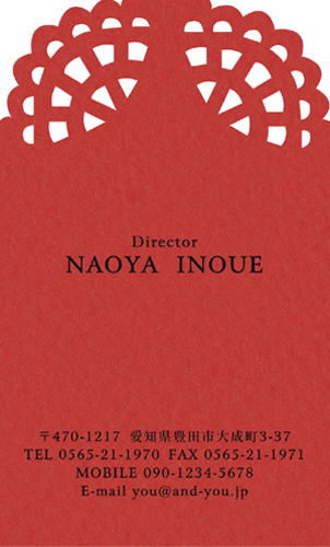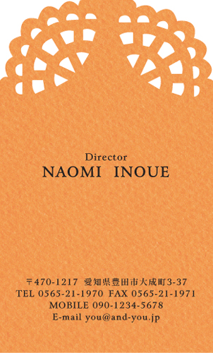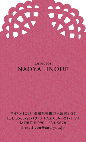 女性に人気 型抜き名刺 NI-PA-781 カテゴリ > 女性に人気 型抜き名刺 表 ※オンマウスで拡大表示いたします。 サイズ 91mm × 55mm このデザインで注文する このデザインでFAX注文 裏面デザインについて このデザインをお気に入りに追加 この商品に対するお問い合わせ 色違いデザイン NI-PA-066NI-PA-113NI-PA-068NI-PA-069 NI-PA-115NI-PA-112NI-PA-111NI-PA-713 NI-PA-780NI-PA-782 簡単料金計算 用紙を選択 カラー用紙/コーラル (凸凹した柄の入った用紙) 枚数を選択 203050100150200300400500 金額をチェック 送料はこちら レビューコメント レビュー・コメントはまだありません。 閉じる レビューをお書きください このデザインのレビュー(ご感想)をぜひご記入ください レビュー入力欄 レビューは不特定多数の方がご覧になりますので、 個人情報などを含まれないようにご注意ください。 投稿していただいた内容について、弊社で不適切と判断した場合には、 お断りなく非掲載とさせていただく場合がございます。 レビュー記入者の種別 閲覧者 購入者 レビュー記入者の名前(ニックネーム) 下の数字を入力: