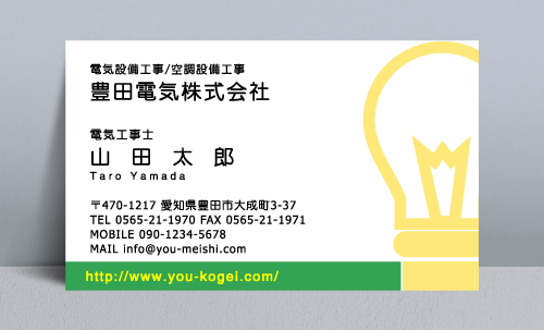 職業別名刺:電気屋 denkiya-NI-009 カテゴリ > 電気屋・電気工事店 名刺デザイン 表 イメージ ※オンマウスで拡大表示いたします。 サイズ 91mm × 55mm このデザインで注文する このデザインでFAX注文 裏面デザインについて このデザインをお気に入りに追加 この商品に対するお問い合わせ 色違いデザイン denkiya-NI-010 簡単料金計算 用紙を選択 ハイトーン (最もスタンダードな白い用紙) マイルド (白味を少し抑えたオフホワイトの用紙) サニー (クリーム色の用紙) 光沢紙 ※両面印刷不可 ※ラインストーン不可半透明(トレーシングペーパー) ※両面印刷不可 ※ラインストーン不可半透明(NTパイル) ※両面印刷不可 ※ラインストーン不可厚紙:オフホワイト 枚数を選択 203050100150200300400500 金額をチェック 送料はこちら レビューコメント 1 件のレビュー・コメントがあります。 デンタツ 様(閲覧者) 2024年05月19日 大きな電球イラストが目に飛び込んできました!オレンジ色の下帯と相性... 続きを読む デンタツ 様(閲覧者) 2024年05月19日 大きな電球イラストが目に飛び込んできました!オレンジ色の下帯と相性抜群で印象に残ります。一目で伝わるアイコンイラストとデザインがイイですね 閉じる レビューをお書きください このデザインのレビュー(ご感想)をぜひご記入ください レビュー入力欄 レビューは不特定多数の方がご覧になりますので、 個人情報などを含まれないようにご注意ください。 投稿していただいた内容について、弊社で不適切と判断した場合には、 お断りなく非掲載とさせていただく場合がございます。 レビュー記入者の種別 閲覧者 購入者 レビュー記入者の名前(ニックネーム) 下の数字を入力: 関連デザイン penki-ay001 penki-ay002 penki-ay003 penki-ay004 penki-ay005 penki-ay006 aipc017 aypc024 aywa012 aywa046 dogtrainer-ni013 dogtrainer-ni014