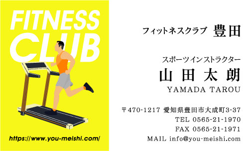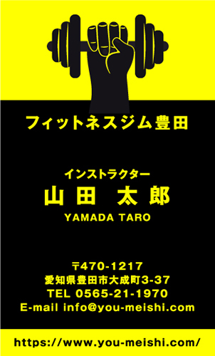 fitness-NI-008 フィットネス ジム スタジオ インストラクター 名刺デザイン ダンベルを持ち上げているイラストを入れたデザインです。ブラックとイエローでインパクトある名刺に仕上がりました。 |