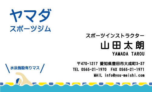fitness-NI-014 フィットネス ジム スタジオ インストラクター 名刺デザイン 爽やかな印象を与える落ち着いたブルーを使用しました。写真を載せられるタイプの名刺デザインです。 |