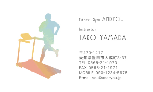 fitness-HR-005 フィットネス ジム スタジオ インストラクター 名刺デザイン ランニングマシンで走っている人のシルエット入り名刺です。優しくお洒落なデザインです。 |