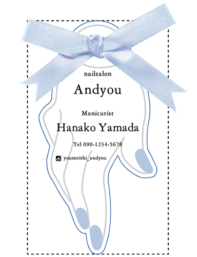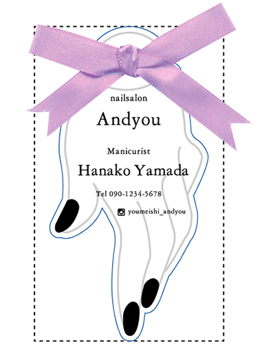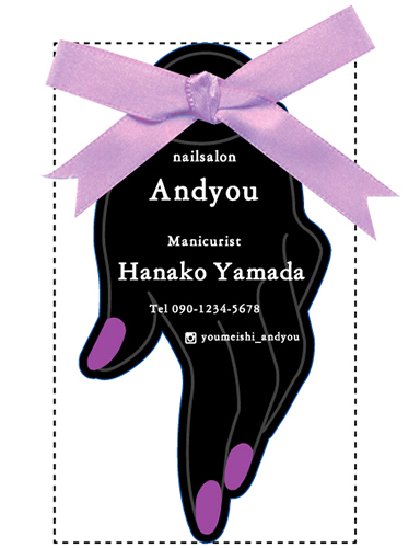 当店で名刺にリボン通し用の穴を2か所あけます。リボンを通して、蝶ちょ結びをすれば完成です!
