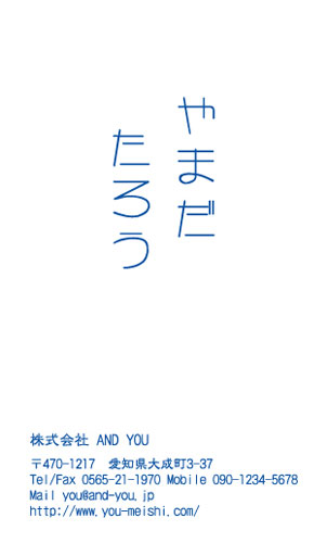 シンプルデザイン名刺 AI-SN-009 カテゴリ > シンプルデザイン名刺 表 ※オンマウスで拡大表示いたします。 サイズ 91mm × 55mm このデザインで注文する このデザインでFAX注文 裏面デザインについて このデザインをお気に入りに追加 この商品に対するお問い合わせ 色違いデザイン AI-SN-008AI-SN-010 簡単料金計算 用紙を選択 ハイトーン (最もスタンダードな白い用紙) マイルド (白味を少し抑えたオフホワイトの用紙) サニー (クリーム色の用紙) グレイ (緑がかった明るい灰色の用紙) 光沢紙 ※両面印刷不可 ※ラインストーン不可半透明(トレーシングペーパー) ※両面印刷不可 ※ラインストーン不可半透明(NTパイル) ※両面印刷不可 ※ラインストーン不可厚紙:オフホワイト 枚数を選択 203050100150200300400500 金額をチェック 送料はこちら レビューコメント 2 件のレビュー・コメントがあります。 パン 様(閲覧者) 2025年09月20日 なんかかわいい、フォントの感じかな?親しみやすさがあっていい!ショ... 続きを読む パン 様(閲覧者) 2025年09月20日 なんかかわいい、フォントの感じかな?親しみやすさがあっていい!ショッキングピンクぽい感じもかわいらしいし、パッと見シンプルなんだけど、しっかりインパクト残していく感じ最高! きのこ 様(閲覧者) 2019年03月26日 シンプルなのに、インパクトが有る名刺ですね。色も名前のフォントも可愛いです。その上、名前が「ひらがな」なのも良いですね。読みやすく、覚えてもらい易そうな気がします。名刺はインパクトも大切ですよね。 閉じる レビューをお書きください このデザインのレビュー(ご感想)をぜひご記入ください レビュー入力欄 レビューは不特定多数の方がご覧になりますので、 個人情報などを含まれないようにご注意ください。 投稿していただいた内容について、弊社で不適切と判断した場合には、 お断りなく非掲載とさせていただく場合がございます。 レビュー記入者の種別 閲覧者 購入者 レビュー記入者の名前(ニックネーム) 下の数字を入力: 関連デザイン penki-ay001 penki-ay002 penki-ay003 penki-ay004 penki-ay005 penki-ay006 nicl005 nisq043 NI-SH-100 aico031 aikd010 aiko009