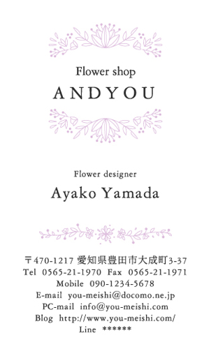 花名刺 AK-HA-046 カテゴリ > 花・花柄名刺 表 ※オンマウスで拡大表示いたします。 サイズ 91mm × 55mm このデザインで注文する このデザインでFAX注文 裏面デザインについて このデザインをお気に入りに追加 この商品に対するお問い合わせ 色違いデザイン AK-HA-045AK-HA-047 簡単料金計算 用紙を選択 ハイトーン (最もスタンダードな白い用紙) 光沢紙 ※両面印刷不可 ※ラインストーン不可半透明(トレーシングペーパー) ※両面印刷不可 ※ラインストーン不可半透明(NTパイル) ※両面印刷不可 ※ラインストーン不可 枚数を選択 203050100150200300400500 金額をチェック 送料はこちら レビューコメント レビュー・コメントはまだありません。 閉じる レビューをお書きください このデザインのレビュー(ご感想)をぜひご記入ください レビュー入力欄 レビューは不特定多数の方がご覧になりますので、 個人情報などを含まれないようにご注意ください。 投稿していただいた内容について、弊社で不適切と判断した場合には、 お断りなく非掲載とさせていただく場合がございます。 レビュー記入者の種別 閲覧者 購入者 レビュー記入者の名前(ニックネーム) 下の数字を入力: 関連デザイン penki-ay001 penki-ay002 penki-ay003 penki-ay004 penki-ay005 penki-ay006 aipc002 aisq025 akce033 akcu002 macu011 nisn099
