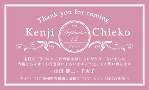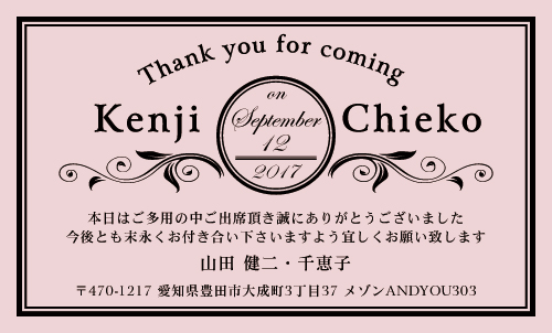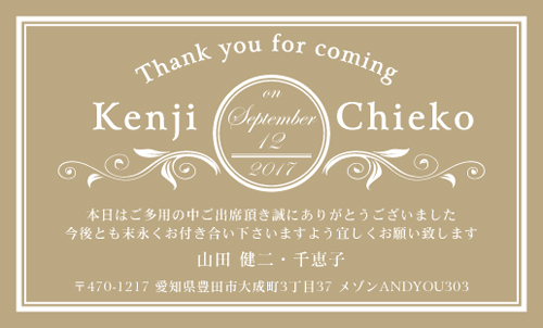 ウエディング カード(結婚報告カード) AK-K-013 カテゴリ > 結婚式 サンキューカード・サンクスカード【スタンダードデザイン】 表 ※オンマウスで拡大表示いたします。 サイズ 91mm × 55mm このデザインで注文する このデザインでFAX注文 裏面デザインについて このデザインをお気に入りに追加 この商品に対するお問い合わせ 色違いデザイン AK-K-014AK-K-015AK-K-016AK-K-017 AK-K-018 簡単料金計算 用紙を選択 ハイトーン (最もスタンダードな白い用紙) マイルド (白味を少し抑えたオフホワイトの用紙) サニー (クリーム色の用紙) グレイ (緑がかった明るい灰色の用紙) 光沢紙 ※両面印刷不可 ※ラインストーン不可半透明(トレーシングペーパー) ※両面印刷不可 ※ラインストーン不可半透明(NTパイル) ※両面印刷不可 ※ラインストーン不可 枚数を選択 203050100150200300400500 金額をチェック 送料はこちら レビューコメント レビュー・コメントはまだありません。 閉じる レビューをお書きください このデザインのレビュー(ご感想)をぜひご記入ください レビュー入力欄 レビューは不特定多数の方がご覧になりますので、 個人情報などを含まれないようにご注意ください。 投稿していただいた内容について、弊社で不適切と判断した場合には、 お断りなく非掲載とさせていただく場合がございます。 レビュー記入者の種別 閲覧者 購入者 レビュー記入者の名前(ニックネーム) 下の数字を入力: 関連デザイン aksq001 nice060 nice105 nice270 nice278 nicu193 nicu196 penki-ay001 penki-ay002 penki-ay003 penki-ay004 penki-ay005