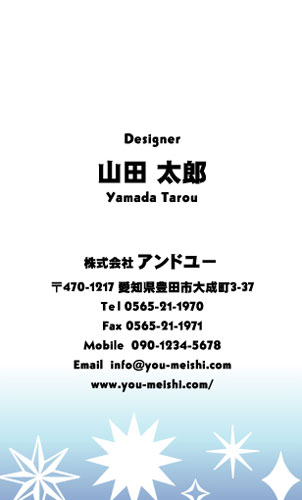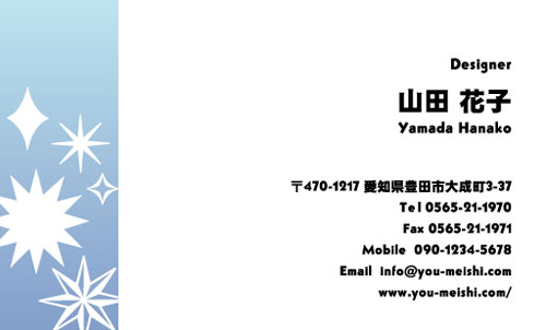 かわいい名刺 AS-CU-006 カテゴリ > かわいいデザイン名刺 表 ※オンマウスで拡大表示いたします。 サイズ 91mm × 55mm このデザインで注文する このデザインでFAX注文 裏面デザインについて このデザインをお気に入りに追加 この商品に対するお問い合わせ 色違いデザイン AS-CU-007AS-CU-008 簡単料金計算 用紙を選択 光沢紙 ※両面印刷不可 ※ラインストーン不可半透明(トレーシングペーパー) ※両面印刷不可 ※ラインストーン不可半透明(NTパイル) ※両面印刷不可 ※ラインストーン不可 枚数を選択 203050100150200300400500 金額をチェック 送料はこちら レビューコメント 2 件のレビュー・コメントがあります。 由紀恵 様(閲覧者) 2025年11月01日 キレー!!夜空のようでなんだか神秘的な感じがしました。星がキラキラ... 続きを読む 由紀恵 様(閲覧者) 2025年11月01日 キレー!!夜空のようでなんだか神秘的な感じがしました。星がキラキラ輝いていて美しいという言葉が似合うな、と思いました。名前だけを大きくしたデザインもとてもよく合っていますね! なつこ 様(閲覧者) 2019年06月04日 幻想的なグラデーションの背景はかっこいいのに、やや崩した形のお星様が可愛くてメルヘンチックですね。月の光に照らされた夜に星がダンスする、みたいな物語性のありそうなデザインに見えて、なんだか楽しいです♬ 閉じる レビューをお書きください このデザインのレビュー(ご感想)をぜひご記入ください レビュー入力欄 レビューは不特定多数の方がご覧になりますので、 個人情報などを含まれないようにご注意ください。 投稿していただいた内容について、弊社で不適切と判断した場合には、 お断りなく非掲載とさせていただく場合がございます。 レビュー記入者の種別 閲覧者 購入者 レビュー記入者の名前(ニックネーム) 下の数字を入力: 関連デザイン aisn017 aisn021 ayco040 ayco041 ayco048 ayco049 aykd010 aykd011 aykd012 aykd018 ayl003 ayl008