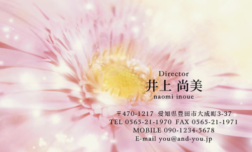 花名刺 AY-HA-010 カテゴリ > 花・花柄名刺 表 ※オンマウスで拡大表示いたします。 サイズ 91mm × 55mm このデザインで注文する このデザインでFAX注文 裏面デザインについて このデザインをお気に入りに追加 この商品に対するお問い合わせ 簡単料金計算 用紙を選択 ハイトーン (最もスタンダードな白い用紙) マイルド (白味を少し抑えたオフホワイトの用紙) サニー (クリーム色の用紙) グレイ (緑がかった明るい灰色の用紙) 半透明(トレーシングペーパー) ※両面印刷不可 ※ラインストーン不可半透明(NTパイル) ※両面印刷不可 ※ラインストーン不可光沢紙 ※両面印刷不可 ※ラインストーン不可 枚数を選択 203050100150200300400500 金額をチェック 送料はこちら レビューコメント 3 件のレビュー・コメントがあります。 花衣 様(閲覧者) 2016年03月15日 大きく映し出されたショッキングピンクのガーベラ。とても印象的で、パ... 続きを読む 花衣 様(閲覧者) 2016年03月15日 大きく映し出されたショッキングピンクのガーベラ。とても印象的で、パッションがあります。素敵。この図案なら、横文字で然りなのに、縦文字にしていることに、こだわりを感じました。花びらがあたかも花火のようにも見えてきて、華やかなものを感じます。こんなに間近にガーベラを見たことがなかったので非常に、瞼の奥に焼き付きましたね。 なな 様(閲覧者) 2015年03月18日 大きなお花と名前などの文字の配列バランスが最高です。名前と読み仮名のアルファベットでお花を囲むようになっているので、一体感があると思います。細かい住所やメールアドレスなどは、白地の部分に印刷されているので、読みやすさも考えられているのだなあと思いました。会社名が大き目に印刷されて強調されているのもすごくいいですよね。ちゃんと主張しているような感じがしました。 ゆき 様(閲覧者) 2014年04月03日 濃いピンクのガーベラがキレイ!!リアルに描かれていて凄く細かいところまで分かって素敵!!名前の部分が細文字の文体で、字がキレイな人が書いた感じで「この名刺の方は字がキレイなのかな?」って思いますね♪右下のローマ字もカワイイですね!!ガーベラの真ん中が黒っぽいので、それに合わせた黒文字が統一感があってスッキリまとまった感じがします! 閉じる レビューをお書きください このデザインのレビュー(ご感想)をぜひご記入ください レビュー入力欄 レビューは不特定多数の方がご覧になりますので、 個人情報などを含まれないようにご注意ください。 投稿していただいた内容について、弊社で不適切と判断した場合には、 お断りなく非掲載とさせていただく場合がございます。 レビュー記入者の種別 閲覧者 購入者 レビュー記入者の名前(ニックネーム) 下の数字を入力: 関連デザイン penki-ay001 penki-ay002 penki-ay003 penki-ay004 penki-ay005 penki-ay006 nipo102 nipo103 nipo104 nipo105 nipo106 nipo107