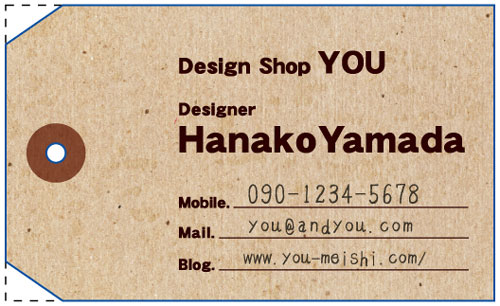 切り抜き名刺 AY-KIRI-046 カテゴリ > 切り抜き名刺 表 ※オンマウスで拡大表示いたします。 切抜きサイズ 縦 55 mm×横 91 mm このデザインで注文する このデザインでFAX注文 裏面デザインについて このデザインをお気に入りに追加 この商品に対するお問い合わせ 色違いデザイン AY-KIRI-047 簡単料金計算 用紙を選択 ハイトーン (最もスタンダードな白い用紙) マイルド (白味を少し抑えたオフホワイトの用紙) サニー (クリーム色の用紙) グレイ (灰色の用紙) 光沢紙 ※両面印刷不可 ※ラインストーン不可半透明(トレーシングペーパー) ※両面印刷不可 ※ラインストーン不可半透明(NTパイル) ※両面印刷不可 ※ラインストーン不可 枚数を選択 203050100150200300400500 金額をチェック 送料はこちら レビューコメント 3 件のレビュー・コメントがあります。 しげ 様(閲覧者) 2023年01月25日 荷札風の名刺ってユニークですね。実際に穴が開いてるなら紐を通して本... 続きを読む しげ 様(閲覧者) 2023年01月25日 荷札風の名刺ってユニークですね。実際に穴が開いてるなら紐を通して本当に荷札っぽく使えるし、用途の幅が色々ありそうです。電話番号やメールアドレスの部分が手書き風の書体になってるところも再現が細かくていいですね! さがみ 様(閲覧者) 2016年03月12日 荷札みたいな形がとても可愛らしい名刺ですね!色味も本当の荷札みたい。名刺の左端が落としてありますが、右側は普通の名刺サイズなので、名刺入れの中で動いてしまうこともなくきちんと保管しておくことができそうですね。切り抜き名刺は形によっては持ち歩くのが大変ということも多いのですが、その点、こちらの名刺は安心です。携帯やメアドなど後から書きこんだ風になっているのが面白いです。 ピーナッツ 様(閲覧者) 2015年06月20日 荷札のようなデザインが斬新でカッコイイですね。もらった人が間違えてしまいそうなリアルさが面白くて素敵です。ベージュのざらざらした紙の質感まで伝わって茶色の文字とタイプライターで打ったような文字が全体のバランスを一層かっこよくしていますね。荷札のように切り抜かれていますから、丸い穴に紐やゴムをつけて贈り物にも活用できる便利名刺ですね。 閉じる レビューをお書きください このデザインのレビュー(ご感想)をぜひご記入ください レビュー入力欄 レビューは不特定多数の方がご覧になりますので、 個人情報などを含まれないようにご注意ください。 投稿していただいた内容について、弊社で不適切と判断した場合には、 お断りなく非掲載とさせていただく場合がございます。 レビュー記入者の種別 閲覧者 購入者 レビュー記入者の名前(ニックネーム) 下の数字を入力: