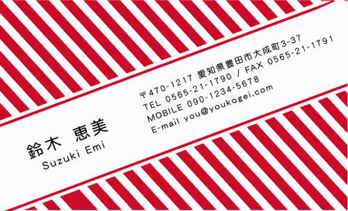 シンプル名刺 AY-SN-019 カテゴリ > シンプルデザイン名刺 表 ※オンマウスで拡大表示いたします。 サイズ 91mm × 55mm このデザインで注文する このデザインでFAX注文 裏面デザインについて このデザインをお気に入りに追加 この商品に対するお問い合わせ 色違いデザイン AY-SN-018 簡単料金計算 用紙を選択 ハイトーン (最もスタンダードな白い用紙) マイルド (白味を少し抑えたオフホワイトの用紙) サニー (クリーム色の用紙) グレイ (緑がかった明るい灰色の用紙) 光沢紙 ※両面印刷不可 ※ラインストーン不可半透明(トレーシングペーパー) ※両面印刷不可 ※ラインストーン不可半透明(NTパイル) ※両面印刷不可 ※ラインストーン不可 枚数を選択 203050100150200300400500 金額をチェック 送料はこちら レビューコメント 3 件のレビュー・コメントがあります。 類 様(閲覧者) 2018年04月18日 この名刺の中には、青色が使われているのですね。クールな印象があり、... 続きを読む 類 様(閲覧者) 2018年04月18日 この名刺の中には、青色が使われているのですね。クールな印象があり、見応えがあってとても素晴らしいと感じます。「真面目で賢い」というポジティブな印象を相手に抱かせることが出来そうですね。どこの場所に行っても活躍できそう。文字が斜めに書かれているのが、非常にお洒落。書体がすべて統一されているのも、文字が読みやすくて良いと思いました。 水希 様(閲覧者) 2017年11月09日 「自由に、のびやかに」というイメージのある名刺です。名刺の中に使われている青色が、人の心を明るく前向きな気持ちにしてくれます。互いの緊張の糸がほぐれ、落ち着いた気持ちで名刺交換をすることが出来そうですね。まるで空を飛んでいるかのような、開放的な気持ちにもなりました。文字が斜めに書かれているのもお洒落で良いですね。文字に使われている書体もシンプルで読みやすいです。 jun 様(閲覧者) 2013年10月27日 第一印象が、目に鮮やか!ストライプ使いがシャープな名刺です。ストライプのうちの一本だけ、幅が太目になっていますが、それがデザインン・アクセントとして、とても効果的ですね!これによって、出来上がりがワンランクアップしている感じです。名前や住所なども、斜めのスペースの中に配置されていて、個性的。それでいて、知的な感じもするので、仕事にも使えそうだと思います。 閉じる レビューをお書きください このデザインのレビュー(ご感想)をぜひご記入ください レビュー入力欄 レビューは不特定多数の方がご覧になりますので、 個人情報などを含まれないようにご注意ください。 投稿していただいた内容について、弊社で不適切と判断した場合には、 お断りなく非掲載とさせていただく場合がございます。 レビュー記入者の種別 閲覧者 購入者 レビュー記入者の名前(ニックネーム) 下の数字を入力: 関連デザイン penki-ay001 penki-ay002 penki-ay003 penki-ay004 penki-ay005 penki-ay006 akoy011 nice279 aice001 aice009 aico018 aiha026