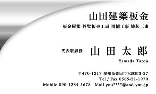 建築板金・板金屋 名刺デザイン k-bankin-AI-047 カテゴリ > 建築板金・板金屋根・外壁板金・板金屋 名刺デザイン ※特殊印刷(ゴールド)ではございません。ゴールド風にみせた色味で作成したグラデーションとなります。 表 イメージ ※オンマウスで拡大表示いたします。 サイズ 91mm × 55mm このデザインで注文する このデザインでFAX注文 裏面デザインについて このデザインをお気に入りに追加 この商品に対するお問い合わせ 色違いデザイン k-bankin-AI-048 簡単料金計算 用紙を選択 光沢紙 ※両面印刷不可 ※ラインストーン不可 枚数を選択 203050100150200300400500 金額をチェック 送料はこちら レビューコメント レビュー・コメントはまだありません。 閉じる レビューをお書きください このデザインのレビュー(ご感想)をぜひご記入ください レビュー入力欄 レビューは不特定多数の方がご覧になりますので、 個人情報などを含まれないようにご注意ください。 投稿していただいた内容について、弊社で不適切と判断した場合には、 お断りなく非掲載とさせていただく場合がございます。 レビュー記入者の種別 閲覧者 購入者 レビュー記入者の名前(ニックネーム) 下の数字を入力: