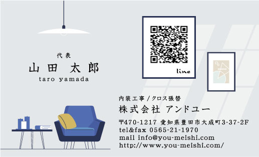 クロス屋・内装業 名刺デザイン kurosu-AY-003 カテゴリ > クロス屋・内装業 名刺デザイン 清潔感のある内装のデザイン。壁に掛けられた絵のようにQRコードが載せられます。 表 イメージ ※オンマウスで拡大表示いたします。 サイズ 91mm × 55mm このデザインで注文する このデザインでFAX注文 裏面デザインについて このデザインをお気に入りに追加 この商品に対するお問い合わせ 色違いデザイン kurosu-AY-004 簡単料金計算 用紙を選択 ハイトーン (最もスタンダードな白い用紙) マイルド (白味を少し抑えたオフホワイトの用紙) サニー (クリーム色の用紙) グレイ (緑がかった明るい灰色の用紙) 光沢紙 ※両面印刷不可 ※ラインストーン不可半透明(トレーシングペーパー) ※両面印刷不可 ※ラインストーン不可半透明(NTパイル) ※両面印刷不可 ※ラインストーン不可厚紙:オフホワイト 枚数を選択 203050100150200300400500 金額をチェック 送料はこちら レビューコメント レビュー・コメントはまだありません。 閉じる レビューをお書きください このデザインのレビュー(ご感想)をぜひご記入ください レビュー入力欄 レビューは不特定多数の方がご覧になりますので、 個人情報などを含まれないようにご注意ください。 投稿していただいた内容について、弊社で不適切と判断した場合には、 お断りなく非掲載とさせていただく場合がございます。 レビュー記入者の種別 閲覧者 購入者 レビュー記入者の名前(ニックネーム) 下の数字を入力: