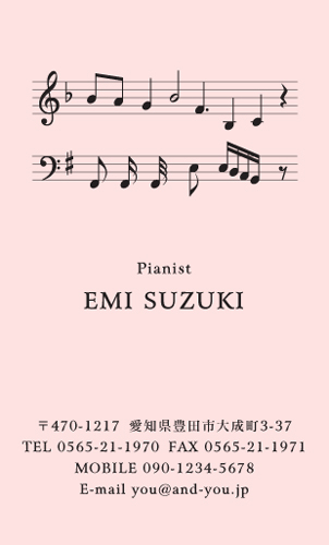 職業別名刺:音楽系 music-NI-001 カテゴリ > アーティスト・音楽関係・演奏家・作曲家・編曲家 名刺デザイン 表 ※オンマウスで拡大表示いたします。 サイズ 91mm × 55mm このデザインで注文する このデザインでFAX注文 裏面デザインについて このデザインをお気に入りに追加 この商品に対するお問い合わせ 色違いデザイン music-NI-002music-NI-003 簡単料金計算 用紙を選択 ハイトーン (最もスタンダードな白い用紙) マイルド (白味を少し抑えたオフホワイトの用紙) サニー (クリーム色の用紙) グレイ (緑がかった明るい灰色の用紙) 光沢紙 ※両面印刷不可 ※ラインストーン不可半透明(トレーシングペーパー) ※両面印刷不可 ※ラインストーン不可半透明(NTパイル) ※両面印刷不可 ※ラインストーン不可厚紙:オフホワイト 枚数を選択 203050100150200300400500 金額をチェック 送料はこちら レビューコメント 3 件のレビュー・コメントがあります。 りりか 様(閲覧者) 2023年02月10日 大きな音符の中にちっちゃい音符が隠れてて鬼かわです♡音楽好きな人に... 続きを読む りりか 様(閲覧者) 2023年02月10日 大きな音符の中にちっちゃい音符が隠れてて鬼かわです♡音楽好きな人にピッタリで、音楽関係のお仕事してる人に似合いそう!ピンクカラーが甘めで優しさのある色だから幅人い年齢の人が使いやすそうです! マミー 様(閲覧者) 2022年11月08日 ワンポイント音符♪のなかに小さな音符♪があってめちゃめちゃ可愛い!!白ベースに、ピンクのさりげない感じがなんとも可愛らしい♡女性に圧倒的人気がありそうな甘い感じがいい! ピアノの森 様(閲覧者) 2019年06月19日 小さな音符から出来ているト音記号が可愛らしいですね。シンプルですが可憐なデザインが愛くるしいいです。音楽好きの女性の方が持っていてもステキですよね。優しいピンク色に癒されます。 閉じる レビューをお書きください このデザインのレビュー(ご感想)をぜひご記入ください レビュー入力欄 レビューは不特定多数の方がご覧になりますので、 個人情報などを含まれないようにご注意ください。 投稿していただいた内容について、弊社で不適切と判断した場合には、 お断りなく非掲載とさせていただく場合がございます。 レビュー記入者の種別 閲覧者 購入者 レビュー記入者の名前(ニックネーム) 下の数字を入力: 関連デザイン penki-ay001 penki-ay002 penki-ay003 penki-ay004 penki-ay005 penki-ay006 nicu126 nicu129 nicu130 nicu134 nicu135 nicu136