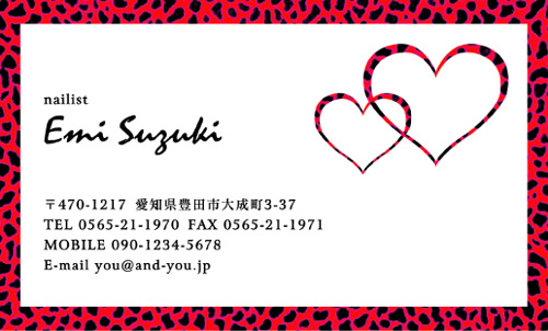 職業別名刺:ネイリスト nailist-AY-CE-008 カテゴリ > ネイルサロン・ネイリスト 名刺デザイン 表 ※オンマウスで拡大表示いたします。 サイズ 91mm × 55mm このデザインで注文する このデザインでFAX注文 裏面デザインについて このデザインをお気に入りに追加 この商品に対するお問い合わせ 色違いデザイン nailist-AY-CE-009 簡単料金計算 用紙を選択 ハイトーン (最もスタンダードな白い用紙) マイルド (白味を少し抑えたオフホワイトの用紙) サニー (クリーム色の用紙) グレイ (緑がかった明るい灰色の用紙) 光沢紙 ※両面印刷不可 ※ラインストーン不可半透明(トレーシングペーパー) ※両面印刷不可 ※ラインストーン不可半透明(NTパイル) ※両面印刷不可 ※ラインストーン不可 枚数を選択 203050100150200300400500 金額をチェック 送料はこちら レビューコメント 2 件のレビュー・コメントがあります。 ふなっしゃー 様(閲覧者) 2013年10月30日 これは、大阪のおばちゃんが大好きな「ヒョウ柄」やんか!。おばちゃん... 続きを読む ふなっしゃー 様(閲覧者) 2013年10月30日 これは、大阪のおばちゃんが大好きな「ヒョウ柄」やんか!。おばちゃん、この名刺欲しいわー。えっ?ネイルのお店?ヒョウ柄の服や小物だけでは物足りないウチにはピッタリやわ!この店、いいセンスしてんで。おばちゃんは、もちろん爪も「ヒョウ柄」にするで。さっそく予約の電話するわ。もちろん、気に入ったら友達にも紹介するで! あーちゃん 様(閲覧者) 2013年04月23日 私はネイリストとして働いています。可愛くデコしたネイルが大好きなので名刺も派手で可愛いデザインの物にしたいなーと考えていました。このデザインの名刺、めちゃくちゃ可愛くて一目で気に入っちゃいました♪ヒョウ柄っていうのも目立っていいし、右上のハートマークも良いワンポイントになっていると思います。このデザインの名刺だと渡すのが楽しくなりそうですね。 閉じる レビューをお書きください このデザインのレビュー(ご感想)をぜひご記入ください レビュー入力欄 レビューは不特定多数の方がご覧になりますので、 個人情報などを含まれないようにご注意ください。 投稿していただいた内容について、弊社で不適切と判断した場合には、 お断りなく非掲載とさせていただく場合がございます。 レビュー記入者の種別 閲覧者 購入者 レビュー記入者の名前(ニックネーム) 下の数字を入力: