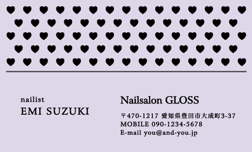 ポップなハートのモチーフですが、淡いピンクに黒一色なので、かわいくなりすぎていないところが好感を持てる名刺ですね。