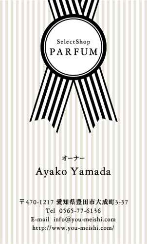 かわいい名刺 NI-CU-175 カテゴリ > かわいいデザイン名刺 表 ※オンマウスで拡大表示いたします。 サイズ 91mm × 55mm このデザインで注文する このデザインでFAX注文 裏面デザインについて このデザインをお気に入りに追加 この商品に対するお問い合わせ 色違いデザイン NI-CU-173NI-CU-174 簡単料金計算 用紙を選択 ハイトーン (最もスタンダードな白い用紙) マイルド (白味を少し抑えたオフホワイトの用紙) サニー (クリーム色の用紙) 光沢紙 ※両面印刷不可 ※ラインストーン不可厚紙:オフホワイト 枚数を選択 203050100150200300400500 金額をチェック 送料はこちら レビューコメント 2 件のレビュー・コメントがあります。 なぎ 様(閲覧者) 2015年12月13日 細いストライプの背景がとてもお洒落!縦長に用紙を使って、縦のストラ... 続きを読む なぎ 様(閲覧者) 2015年12月13日 細いストライプの背景がとてもお洒落!縦長に用紙を使って、縦のストライプの背景というのはものすごくすっきりとスマートに見えるんですね。上質なものを扱っているんだろうなという印象を受けました。ロゼットの中に店名が入るなんて可愛いですね。ラベルのようにも見えて、目を引くポイントになっているなと思いました。ストライプの背景に横書きの文字なので非常に読みやすくていいと思います。 ベンガルキャット 様(閲覧者) 2015年11月27日 細いピンクのストライプにブラックストライプのクロスリボンがきっちり決まったカッコイイデザインの名刺ですね。お店のユニフォームをデザインしたのかしらと思えるほどかわいいおしゃれ感と高級感がありますね。ショップ名の丸いシールを張ったようなリボンと一体化した可愛さがいいですね。かわいいと一緒にカッコイイが混在する素敵な名刺です。 閉じる レビューをお書きください このデザインのレビュー(ご感想)をぜひご記入ください レビュー入力欄 レビューは不特定多数の方がご覧になりますので、 個人情報などを含まれないようにご注意ください。 投稿していただいた内容について、弊社で不適切と判断した場合には、 お断りなく非掲載とさせていただく場合がございます。 レビュー記入者の種別 閲覧者 購入者 レビュー記入者の名前(ニックネーム) 下の数字を入力: 関連デザイン penki-ay001 penki-ay002 penki-ay003 penki-ay004 penki-ay005 penki-ay006 aiqr006 akoy003 akoy007 akoy009 akoy012 knce002