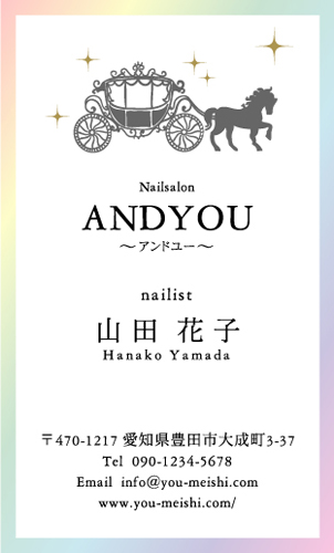 かわいい名刺 NI-CU-248 カテゴリ > かわいいデザイン名刺 表 ※オンマウスで拡大表示いたします。 サイズ 91mm × 55mm このデザインで注文する このデザインでFAX注文 裏面デザインについて このデザインをお気に入りに追加 この商品に対するお問い合わせ 色違いデザイン NI-CU-249NI-CU-250 簡単料金計算 用紙を選択 ハイトーン (最もスタンダードな白い用紙) マイルド (白味を少し抑えたオフホワイトの用紙) サニー (クリーム色の用紙) 光沢紙 ※両面印刷不可 ※ラインストーン不可半透明(トレーシングペーパー) ※両面印刷不可 ※ラインストーン不可半透明(NTパイル) ※両面印刷不可 ※ラインストーン不可厚紙:オフホワイト 枚数を選択 203050100150200300400500 金額をチェック 送料はこちら レビューコメント 2 件のレビュー・コメントがあります。 サナ 様(閲覧者) 2021年11月13日 おとぎ話に出てきそうなキラキラの馬車のデザインがとっても素敵です!... 続きを読む サナ 様(閲覧者) 2021年11月13日 おとぎ話に出てきそうなキラキラの馬車のデザインがとっても素敵です!ふちの色がベージュだからでしょうか、可愛さよりも大人っぽさが勝っていて、高級感がありますね。今の名刺がなくなったら注文してみたいです! やまもとやま 様(閲覧者) 2019年08月18日 可愛い!白馬の王子様が現れちゃいそう☆シンデレラが大好きなのでちょこんと飾られたカボチャの馬車のシルエットが愛らしくて惚れます。淡い縁取りも良いですね。シックな色でまとめられていてオシャレ度200%です。 閉じる レビューをお書きください このデザインのレビュー(ご感想)をぜひご記入ください レビュー入力欄 レビューは不特定多数の方がご覧になりますので、 個人情報などを含まれないようにご注意ください。 投稿していただいた内容について、弊社で不適切と判断した場合には、 お断りなく非掲載とさせていただく場合がございます。 レビュー記入者の種別 閲覧者 購入者 レビュー記入者の名前(ニックネーム) 下の数字を入力: 関連デザイン penki-ay001 penki-ay002 penki-ay003 penki-ay004 penki-ay005 penki-ay006 aiqr015 aiqr016 aisq039 aisq040 akce046 akce047