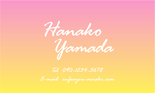 かわいい名刺 NI-CU-257 カテゴリ > かわいいデザイン名刺 表 ※オンマウスで拡大表示いたします。 サイズ 91mm × 55mm このデザインで注文する このデザインでFAX注文 裏面デザインについて このデザインをお気に入りに追加 この商品に対するお問い合わせ 色違いデザイン NI-CU-258NI-CU-259 簡単料金計算 用紙を選択 光沢紙 ※両面印刷不可 ※ラインストーン不可半透明(トレーシングペーパー) ※両面印刷不可 ※ラインストーン不可半透明(NTパイル) ※両面印刷不可 ※ラインストーン不可 枚数を選択 203050100150200300400500 金額をチェック 送料はこちら レビューコメント 3 件のレビュー・コメントがあります。 ゆーき 様(閲覧者) 2025年02月07日 下からブルー、上にかけてグリーンになっていくの爽やかで、白の筆記体... 続きを読む ゆーき 様(閲覧者) 2025年02月07日 下からブルー、上にかけてグリーンになっていくの爽やかで、白の筆記体がめっちゃ映える!なんか南国気分になりますね!明るく晴れやかな気持ちにしてくれるから、使うのが楽しみになりますね! RF 様(閲覧者) 2021年04月03日 爽やかな印象を受ける名刺ですね。私は海を連想してしまいました。夏にぴったりな名刺だと思います。文字が白いので少し見にくいかなーと思いましたが、コレがおしゃれなんでしょうね♪筆記体の文字も素敵です☆ はるちゃんママ 様(閲覧者) 2020年12月19日 文字のシンプルな感じとナチュラルなグラデーションカラーがいいですね!名刺として使う、というよりもショップの紹介カードとかポイントカードに向いてそうなデザインだな~っと思いました!! 閉じる レビューをお書きください このデザインのレビュー(ご感想)をぜひご記入ください レビュー入力欄 レビューは不特定多数の方がご覧になりますので、 個人情報などを含まれないようにご注意ください。 投稿していただいた内容について、弊社で不適切と判断した場合には、 お断りなく非掲載とさせていただく場合がございます。 レビュー記入者の種別 閲覧者 購入者 レビュー記入者の名前(ニックネーム) 下の数字を入力: 関連デザイン penki-ay001 penki-ay002 penki-ay003 penki-ay004 penki-ay005 penki-ay006 ayl040 nikd025 piano-ni032 yhco031 aice017 aice018