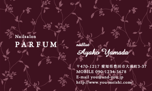 柄物デザイン名刺 NI-GA-063 カテゴリ > 柄物デザイン名刺 表 ※オンマウスで拡大表示いたします。 サイズ 91mm × 55mm このデザインで注文する このデザインでFAX注文 裏面デザインについて このデザインをお気に入りに追加 この商品に対するお問い合わせ 色違いデザイン NI-GA-062NI-GA-064 簡単料金計算 用紙を選択 ハイトーン (最もスタンダードな白い用紙) マイルド (白味を少し抑えたオフホワイトの用紙) サニー (クリーム色の用紙) グレイ (緑がかった明るい灰色の用紙) 光沢紙 ※両面印刷不可 ※ラインストーン不可半透明(トレーシングペーパー) ※両面印刷不可 ※ラインストーン不可半透明(NTパイル) ※両面印刷不可 ※ラインストーン不可 枚数を選択 203050100150200300400500 金額をチェック 送料はこちら レビューコメント 2 件のレビュー・コメントがあります。 するが 様(閲覧者) 2016年01月10日 深みのある背景色にカーキ色の小花がとても美しいです。上品な感じの名... 続きを読む するが 様(閲覧者) 2016年01月10日 深みのある背景色にカーキ色の小花がとても美しいです。上品な感じの名刺で、大人の女性に良さそうですね。背景はあまり主張しすぎていてもだめですし、何もないのも殺風景になってしまいますが、そのバランス感覚が非常に優れた名刺だなと思いました。お名前だけが筆記体になっており、ぐっと目を惹きつけますよね。URLなどの細かな英数字も大変見やすくて、良いと思います。 なな 様(閲覧者) 2015年09月18日 大人っぽい雰囲気のデザインですね。シックで落ち着いたという印象です。背景部分がすべて柄になっているのに、うるさく感じないのは、繊細な花がモチーフだからですね。とてもすっきりしていて、美しく見えます。お名前とショップ名のフォントが違うのもいいですね。これだとどちらがお名前なのかということが一目ではっきりわかるのでとてもいいなと思いました。 閉じる レビューをお書きください このデザインのレビュー(ご感想)をぜひご記入ください レビュー入力欄 レビューは不特定多数の方がご覧になりますので、 個人情報などを含まれないようにご注意ください。 投稿していただいた内容について、弊社で不適切と判断した場合には、 お断りなく非掲載とさせていただく場合がございます。 レビュー記入者の種別 閲覧者 購入者 レビュー記入者の名前(ニックネーム) 下の数字を入力: 関連デザイン penki-ay001 penki-ay002 penki-ay003 penki-ay004 penki-ay005 penki-ay006 aycu047 aywa033 aywa062 hrha018 nicu214 nicu215