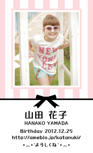 キッズ名刺 NI-KD-039 カテゴリ > キッズ・キッズモデル・子供(こども)用名刺 表 ※オンマウスで拡大表示いたします。 サイズ 91mm × 55mm このデザインで注文する このデザインでFAX注文 裏面デザインについて このデザインをお気に入りに追加 この商品に対するお問い合わせ 色違いデザイン NI-KD-040NI-KD-041 簡単料金計算 用紙を選択 ハイトーン (最もスタンダードな白い用紙) 光沢紙 ※両面印刷不可 ※ラインストーン不可半透明(トレーシングペーパー) ※両面印刷不可 ※ラインストーン不可半透明(NTパイル) ※両面印刷不可 ※ラインストーン不可 枚数を選択 203050100150200300400500 金額をチェック 送料はこちら レビューコメント 2 件のレビュー・コメントがあります。 ぬりえ 様(閲覧者) 2017年06月12日 モノトーンで縦じまの額縁に元気な子供の写真が可愛いですね。額縁の下... 続きを読む ぬりえ 様(閲覧者) 2017年06月12日 モノトーンで縦じまの額縁に元気な子供の写真が可愛いですね。額縁の下にリボンが付いてるので可愛らしさがより増しますね。名前が少し太いゴシック体で書かれているので子供らしく名前を主張していていいですね。文字の最後に「…よろしくね…」の言葉は貰ったお友達が嬉しくなりますよね。名前とお誕生日、ブログのアドレスだけが連絡情報に書かれているキッズ名刺はお友達交換で貰って嬉しい名刺になりますね。 H.K 様(購入者) 2017年01月20日 思っていたよりも出来上がりが良く、とても気に入りました。対応が丁寧で発送も早く、また注文したいと思いました。 閉じる レビューをお書きください このデザインのレビュー(ご感想)をぜひご記入ください レビュー入力欄 レビューは不特定多数の方がご覧になりますので、 個人情報などを含まれないようにご注意ください。 投稿していただいた内容について、弊社で不適切と判断した場合には、 お断りなく非掲載とさせていただく場合がございます。 レビュー記入者の種別 閲覧者 購入者 レビュー記入者の名前(ニックネーム) 下の数字を入力: 関連デザイン penki-ay001 penki-ay002 penki-ay003 penki-ay004 penki-ay005 penki-ay006 aiqr007 aiqr008 aiqr009 aiqr011 aiqr012 aiqr015