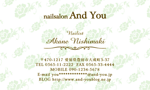 ラインストーン名刺 NI-L-026 カテゴリ > キラキラ ラインストーン名刺 表 ※オンマウスで拡大表示いたします。 サイズ 91mm × 55mm このデザインで注文する このデザインでFAX注文 裏面デザインについて このデザインをお気に入りに追加 この商品に対するお問い合わせ 色違いデザイン NI-L-024NI-L-025 簡単料金計算 用紙を選択 ハイトーン (最もスタンダードな白い用紙) マイルド (白味を少し抑えたオフホワイトの用紙) サニー (クリーム色の用紙) グレイ (緑がかった明るい灰色の用紙) 枚数を選択 203050100150200300400500 金額をチェック 送料はこちら レビューコメント 1 件のレビュー・コメントがあります。 ヒーリングNana 様(閲覧者) 2016年02月15日 モスグリーンは落ち着きます。日本人の原風景の色合いだからです。そん... 続きを読む ヒーリングNana 様(閲覧者) 2016年02月15日 モスグリーンは落ち着きます。日本人の原風景の色合いだからです。そんなモスグリーンの名刺に白で描かれた薔薇の花。和と洋の融合を感じます。そして、さりげなくオレンジのラインストーンが名前の横にありますね。背景がモスグリーンなので目立ちすぎず馴染んだ感じが、いいですね。主張しすぎない感じが、好まれると思います。癒し系の名刺だと思いました。 閉じる レビューをお書きください このデザインのレビュー(ご感想)をぜひご記入ください レビュー入力欄 レビューは不特定多数の方がご覧になりますので、 個人情報などを含まれないようにご注意ください。 投稿していただいた内容について、弊社で不適切と判断した場合には、 お断りなく非掲載とさせていただく場合がございます。 レビュー記入者の種別 閲覧者 購入者 レビュー記入者の名前(ニックネーム) 下の数字を入力: 関連デザイン aiha028 aiha053 aiha056 akha008 akha012 akha015 ayce022 hrha018 penki-ay001 penki-ay002 penki-ay003 penki-ay004
