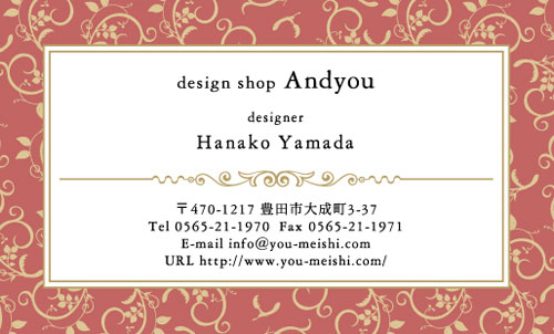 ラインストーン名刺 NI-L-056 カテゴリ > キラキラ ラインストーン名刺 表 ※オンマウスで拡大表示いたします。 サイズ 91mm × 55mm このデザインで注文する このデザインでFAX注文 裏面デザインについて このデザインをお気に入りに追加 この商品に対するお問い合わせ 色違いデザイン NI-L-055NI-L-057 簡単料金計算 用紙を選択 ハイトーン (最もスタンダードな白い用紙) マイルド (白味を少し抑えたオフホワイトの用紙) サニー (クリーム色の用紙) グレイ (緑がかった明るい灰色の用紙) 枚数を選択 203050100150200300400500 金額をチェック 送料はこちら レビューコメント 2 件のレビュー・コメントがあります。 スローリーライフ 様(閲覧者) 2020年06月19日 真っ赤な背景が印象的で気になって拝見させていただきました。上下の飾... 続きを読む スローリーライフ 様(閲覧者) 2020年06月19日 真っ赤な背景が印象的で気になって拝見させていただきました。上下の飾りにさりげなくラインストーンが付いていて高級感もありますよね。名前がローマ字表記なだけでオシャレ度もとてもアップしていて良いと思います。 真紅 様(閲覧者) 2016年06月09日 アンティークなものって茶系だったりするイメージが強いのですが、この名刺は真っ赤な名刺で情熱的です。貴婦人のドレスみたい。または真紅の絨毯みたいなイメージが広がりました。何が素敵かって、ラインストーンが上下に2つも付いていることですね。ゴージャス感が増します。艶っぽさも感じる名刺なので、大人の女性に使ってほしいなと思いました。 閉じる レビューをお書きください このデザインのレビュー(ご感想)をぜひご記入ください レビュー入力欄 レビューは不特定多数の方がご覧になりますので、 個人情報などを含まれないようにご注意ください。 投稿していただいた内容について、弊社で不適切と判断した場合には、 お断りなく非掲載とさせていただく場合がございます。 レビュー記入者の種別 閲覧者 購入者 レビュー記入者の名前(ニックネーム) 下の数字を入力: 関連デザイン penki-ay001 penki-ay002 penki-ay003 penki-ay004 penki-ay005 penki-ay006 ayce027 yhce050 aice007 aice008 aice009 aice010