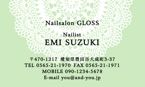 ネイルサロンの名刺として肌色に、ソフトで優しい感じがあって女性らしい雰囲気が良いですね。