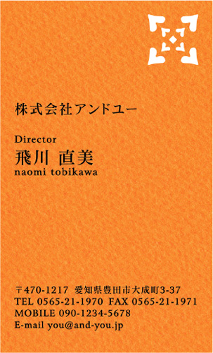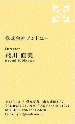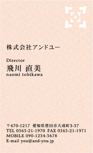縦 コーナー2型抜き NI-PA-397 カテゴリ > 女性に人気 型抜き名刺 表 ※オンマウスで拡大表示いたします。 サイズ 91mm × 55mm このデザインで注文する このデザインでFAX注文 裏面デザインについて このデザインをお気に入りに追加 この商品に対するお問い合わせ 色違いデザイン NI-PA-406NI-PA-405NI-PA-404NI-PA-403 NI-PA-402NI-PA-401NI-PA-400NI-PA-399 NI-PA-398 簡単料金計算 用紙を選択 枚数を選択 203050100150200300400500 金額をチェック 送料はこちら レビューコメント 1 件のレビュー・コメントがあります。 みやこ 様(閲覧者) 2013年12月13日 クラフト紙の質感、全体的にガーリーな雰囲気がすごく気に入りました。... 続きを読む みやこ 様(閲覧者) 2013年12月13日 クラフト紙の質感、全体的にガーリーな雰囲気がすごく気に入りました。型抜きのデザインや大きさも控えめで、いいなと思っています。あまり派手すぎるのは仕事で使う場合NGなので、このぐらいがちょうどいいです。文字の配置も読みやすいし、まさに求めていた名刺のデザインって感じです。早く注文して、仕事で配りたいと思っています。 閉じる レビューをお書きください このデザインのレビュー(ご感想)をぜひご記入ください レビュー入力欄 レビューは不特定多数の方がご覧になりますので、 個人情報などを含まれないようにご注意ください。 投稿していただいた内容について、弊社で不適切と判断した場合には、 お断りなく非掲載とさせていただく場合がございます。 レビュー記入者の種別 閲覧者 購入者 レビュー記入者の名前(ニックネーム) 下の数字を入力: