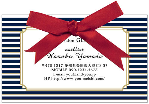 リボン付き名刺 NI-RI-040 カテゴリ > 可愛い リボン名刺 表 ※オンマウスで拡大表示いたします。 サイズ 91mm × 55mm このデザインで注文する このデザインでFAX注文 裏面デザインについて このデザインをお気に入りに追加 この商品に対するお問い合わせ 色違いデザイン NI-RI-039NI-RI-041NI-RI-042NI-RI-043 NI-RI-044 簡単料金計算 用紙を選択 ハイトーン (最もスタンダードな白い用紙) 光沢紙 ※両面印刷不可 ※ラインストーン不可 枚数を選択 2050100150200 金額をチェック 送料はこちら レビューコメント 2 件のレビュー・コメントがあります。 ニン 様(閲覧者) 2025年02月28日 ストライプにかわいい大きなリボンが魅力的ですね。ライトブルーで爽や... 続きを読む ニン 様(閲覧者) 2025年02月28日 ストライプにかわいい大きなリボンが魅力的ですね。ライトブルーで爽やかな雰囲気が素敵です。さりげなくゴールドが使われていて、大人かわいいマリンの名刺が気に入りました。 スプラウト 様(閲覧者) 2022年03月23日 ストライプ柄とゴールドの枠が大人かわいい!柄もリボンもライトブルーで、大人な感じもあり、明るく爽やか。リボンでかわいらしい印象もプラスしていて、大人かわいいがまとまっている1 閉じる レビューをお書きください このデザインのレビュー(ご感想)をぜひご記入ください レビュー入力欄 レビューは不特定多数の方がご覧になりますので、 個人情報などを含まれないようにご注意ください。 投稿していただいた内容について、弊社で不適切と判断した場合には、 お断りなく非掲載とさせていただく場合がございます。 レビュー記入者の種別 閲覧者 購入者 レビュー記入者の名前(ニックネーム) 下の数字を入力: