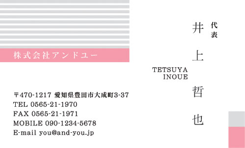 ビジネス名刺 NI-S-026 カテゴリ > シンプル ビジネス名刺 表 ※オンマウスで拡大表示いたします。 サイズ 91mm × 55mm このデザインで注文する このデザインでFAX注文 裏面デザインについて このデザインをお気に入りに追加 この商品に対するお問い合わせ 色違いデザイン NI-S-024NI-S-025 簡単料金計算 用紙を選択 ハイトーン (最もスタンダードな白い用紙) マイルド (白味を少し抑えたオフホワイトの用紙) サニー (クリーム色の用紙) 光沢紙 ※両面印刷不可 ※ラインストーン不可和紙(両面新大礼紙) (両面にレーヨン繊維が漉き込まれています) 半透明(トレーシングペーパー) ※両面印刷不可 ※ラインストーン不可半透明(NTパイル) ※両面印刷不可 ※ラインストーン不可厚紙:オフホワイト 枚数を選択 203050100150200300400500 金額をチェック 送料はこちら レビューコメント 1 件のレビュー・コメントがあります。 じゅんの 様(閲覧者) 2016年10月18日 涼し気な雰囲気の名刺ですね。ボーダーと帯が効果的に使われていて、す... 続きを読む じゅんの 様(閲覧者) 2016年10月18日 涼し気な雰囲気の名刺ですね。ボーダーと帯が効果的に使われていて、すごくすっきりしています。用紙を横使いして、お名前は縦書きというのもカッコいいですね。あんまりこういう配置の名刺ってみたことないような気がします。社名がさりげなく帯の部分に書かれているので、お洒落だなと思いました。右下に小さくボーダーと帯の色が入っているので、バランスよく見えますね。 閉じる レビューをお書きください このデザインのレビュー(ご感想)をぜひご記入ください レビュー入力欄 レビューは不特定多数の方がご覧になりますので、 個人情報などを含まれないようにご注意ください。 投稿していただいた内容について、弊社で不適切と判断した場合には、 お断りなく非掲載とさせていただく場合がございます。 レビュー記入者の種別 閲覧者 購入者 レビュー記入者の名前(ニックネーム) 下の数字を入力: 関連デザイン penki-ay001 penki-ay002 penki-ay003 penki-ay004 penki-ay005 penki-ay006 niqr042 sml026 aico006 aico007 aisq036 ayco057