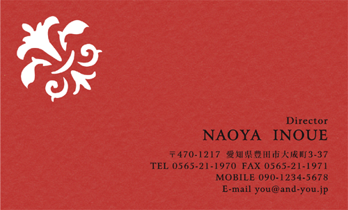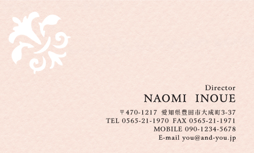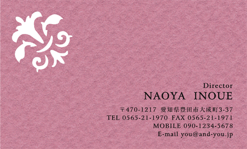 型抜き 名刺 5色 NI-SET-016 カテゴリ > 女性に人気 型抜き名刺(5色セット) 表 ※オンマウスで拡大表示いたします。 サイズ 91mm × 55mm このデザインで注文する このデザインでFAX注文 裏面デザインについて このデザインをお気に入りに追加 この商品に対するお問い合わせ 色違いデザイン NI-SET-137NI-SET-017NI-SET-018NI-SET-019 NI-SET-139NI-SET-726NI-SET-136NI-SET-135 NI-SET-732NI-SET-733NI-SET-734 簡単料金計算 用紙を選択 カラー用紙/紫 (凸凹した柄の入った用紙) 枚数を選択 100枚(20枚×5色)200枚(40枚×5色)300枚(60枚×5色)400枚(80枚×5色)500枚(100枚×5色) 金額をチェック 送料はこちら レビューコメント 1 件のレビュー・コメントがあります。 ハイアットリージェンシー 様(閲覧者) 2014年01月22日 高貴な方が利用する紫を下地のバラを型抜きしたロゴで高級感を表現して... 続きを読む ハイアットリージェンシー 様(閲覧者) 2014年01月22日 高貴な方が利用する紫を下地のバラを型抜きしたロゴで高級感を表現している名刺ですね。高級感とステータスを感じさせるラグジュアリーなサービスを展開している企業や個人にはぴったりですよ。ステータスをお客様に感じさせ、さらなる売上高向上と顧客ロイヤリティを考える企業や個人には打ってつけです。この名刺をお客様に見せれば、顧客の囲い込みは間違いないですね。 閉じる レビューをお書きください このデザインのレビュー(ご感想)をぜひご記入ください レビュー入力欄 レビューは不特定多数の方がご覧になりますので、 個人情報などを含まれないようにご注意ください。 投稿していただいた内容について、弊社で不適切と判断した場合には、 お断りなく非掲載とさせていただく場合がございます。 レビュー記入者の種別 閲覧者 購入者 レビュー記入者の名前(ニックネーム) 下の数字を入力: