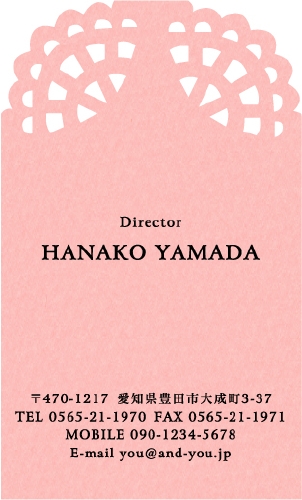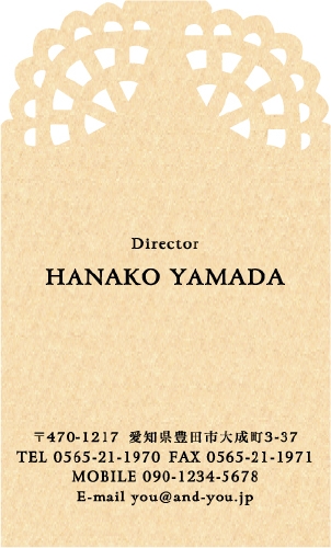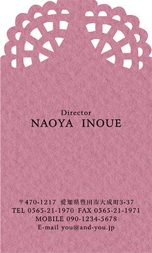 型抜き 名刺 5色 NI-SET-066 カテゴリ > 女性に人気 型抜き名刺(5色セット) 表 ※オンマウスで拡大表示いたします。 サイズ 91mm × 55mm このデザインで注文する このデザインでFAX注文 裏面デザインについて このデザインをお気に入りに追加 この商品に対するお問い合わせ 色違いデザイン NI-SET-113NI-SET-067NI-SET-068NI-SET-069 NI-SET-115NI-SET-713NI-SET-112NI-SET-111 NI-SET-780NI-SET-781NI-SET-782 簡単料金計算 用紙を選択 カラー用紙/紫 (凸凹した柄の入った用紙) 枚数を選択 100枚(20枚×5色)200枚(40枚×5色)300枚(60枚×5色)400枚(80枚×5色)500枚(100枚×5色) 金額をチェック 送料はこちら レビューコメント 1 件のレビュー・コメントがあります。 真由美 様(閲覧者) 2013年09月08日 上部がレース状に切り取られたこの型抜き名刺は、すごく目立ちますね!... 続きを読む 真由美 様(閲覧者) 2013年09月08日 上部がレース状に切り取られたこの型抜き名刺は、すごく目立ちますね!それに、紙の質感がとてもいいです。表面の凹凸感が写真でもよくわかるので、実物はもっと素敵だろうな…と思いますね。私は、常々、名刺の印象のうち、半分くらいは紙が生み出すと思っているので、紙にはうるさい方なんですが、これは、間違いなく◎です。5色セットなのも、楽しみですね。 閉じる レビューをお書きください このデザインのレビュー(ご感想)をぜひご記入ください レビュー入力欄 レビューは不特定多数の方がご覧になりますので、 個人情報などを含まれないようにご注意ください。 投稿していただいた内容について、弊社で不適切と判断した場合には、 お断りなく非掲載とさせていただく場合がございます。 レビュー記入者の種別 閲覧者 購入者 レビュー記入者の名前(ニックネーム) 下の数字を入力: