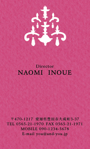 型抜き 名刺 5色セット NI-SET-265 カテゴリ > 女性に人気 型抜き名刺(5色セット) 表 ※オンマウスで拡大表示いたします。 サイズ 91mm × 55mm このデザインで注文する このデザインでFAX注文 裏面デザインについて このデザインをお気に入りに追加 この商品に対するお問い合わせ 色違いデザイン NI-SET-266NI-SET-267NI-SET-268NI-SET-269 NI-SET-270NI-SET-271NI-SET-272NI-SET-273 NI-SET-274 簡単料金計算 用紙を選択 枚数を選択 100枚(20枚×5色)200枚(40枚×5色)300枚(60枚×5色)400枚(80枚×5色)500枚(100枚×5色) 金額をチェック 送料はこちら レビューコメント 1 件のレビュー・コメントがあります。 ロン 様(閲覧者) 2013年07月18日 これはシャンデリアの形でしょうか?この部分が、型抜きされていると言... 続きを読む ロン 様(閲覧者) 2013年07月18日 これはシャンデリアの形でしょうか?この部分が、型抜きされていると言う事でしょうね。名前部分と型抜きされている部分と、住所や電話番号が書かれている部分とのバランスが絶妙に良いバランスと言うか、間隔が取れていると思います。オフィス系というかサラリーマンなどのビジネス用としては難しいと思いますが、サービス業などの名刺としてはおしゃれに使えると思いますね。 閉じる レビューをお書きください このデザインのレビュー(ご感想)をぜひご記入ください レビュー入力欄 レビューは不特定多数の方がご覧になりますので、 個人情報などを含まれないようにご注意ください。 投稿していただいた内容について、弊社で不適切と判断した場合には、 お断りなく非掲載とさせていただく場合がございます。 レビュー記入者の種別 閲覧者 購入者 レビュー記入者の名前(ニックネーム) 下の数字を入力: