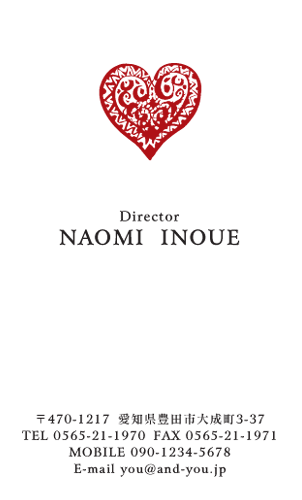 シンプル名刺 NI-SN-022 カテゴリ > シンプルデザイン名刺 表 ※オンマウスで拡大表示いたします。 サイズ 91mm × 55mm このデザインで注文する このデザインでFAX注文 裏面デザインについて このデザインをお気に入りに追加 この商品に対するお問い合わせ 色違いデザイン NI-SN-023 簡単料金計算 用紙を選択 ハイトーン (最もスタンダードな白い用紙) マイルド (白味を少し抑えたオフホワイトの用紙) サニー (クリーム色の用紙) グレイ (緑がかった明るい灰色の用紙) クラフト紙 (ざらっとした質感のクラフト紙) 光沢紙 ※両面印刷不可 ※ラインストーン不可半透明(トレーシングペーパー) ※両面印刷不可 ※ラインストーン不可半透明(NTパイル) ※両面印刷不可 ※ラインストーン不可 枚数を選択 203050100150200300400500 金額をチェック 送料はこちら レビューコメント 3 件のレビュー・コメントがあります。 ai 様(閲覧者) 2025年10月21日 シンプルなんだけど、簡単ハートじゃなくてしっかり手の込んだハートの... 続きを読む ai 様(閲覧者) 2025年10月21日 シンプルなんだけど、簡単ハートじゃなくてしっかり手の込んだハートの存在感しっかりあるし、でも派手じゃないから使いやすい!割と、どの年代でも使いやすいと思う!! ウーロンハイ 様(閲覧者) 2023年10月30日 シンプルなところにパッと目を惹くハートがいいですね!ハートもシンブルなものじゃなくて、柄ありのハートでかっこいいです!なんでだろう、Theシンプルなのに可愛い! 砂川愛 様(閲覧者) 2018年06月14日 黒色のハートマークが描かれていてとても可愛らしい。シンプルな造りながら、愛らしさを忘れていないのが良いですね。小型のハートマークを描くことによって更に愛らしさが増しているような気がします。キュンキュンと胸がときめかずにはいられません。役職名と名前の間に大きな空白がありますね。必要なことがあれば、その余白に書き足すことができそうです。 閉じる レビューをお書きください このデザインのレビュー(ご感想)をぜひご記入ください レビュー入力欄 レビューは不特定多数の方がご覧になりますので、 個人情報などを含まれないようにご注意ください。 投稿していただいた内容について、弊社で不適切と判断した場合には、 お断りなく非掲載とさせていただく場合がございます。 レビュー記入者の種別 閲覧者 購入者 レビュー記入者の名前(ニックネーム) 下の数字を入力: 関連デザイン penki-ay001 penki-ay002 penki-ay003 penki-ay004 penki-ay005 penki-ay006 ail001 ayko006 nicu014 nikg013 nipc058 nipc059