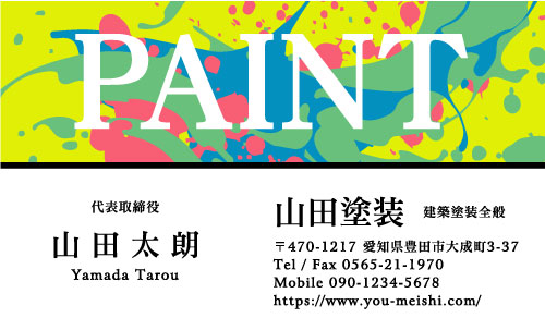 ペンキ屋・塗装屋 名刺デザイン penki-AI-003 カテゴリ > ペンキ屋・塗装屋 名刺デザイン 表 イメージ ※オンマウスで拡大表示いたします。 サイズ 91mm × 55mm このデザインで注文する このデザインでFAX注文 裏面デザインについて このデザインをお気に入りに追加 この商品に対するお問い合わせ 色違いデザイン penki-AI-001penki-AI-002 簡単料金計算 用紙を選択 ハイトーン (最もスタンダードな白い用紙) マイルド (白味を少し抑えたオフホワイトの用紙) 光沢紙 ※両面印刷不可 ※ラインストーン不可半透明(NTパイル) ※両面印刷不可 ※ラインストーン不可厚紙:オフホワイト 枚数を選択 203050100150200300400500 金額をチェック 送料はこちら レビューコメント レビュー・コメントはまだありません。 閉じる レビューをお書きください このデザインのレビュー(ご感想)をぜひご記入ください レビュー入力欄 レビューは不特定多数の方がご覧になりますので、 個人情報などを含まれないようにご注意ください。 投稿していただいた内容について、弊社で不適切と判断した場合には、 お断りなく非掲載とさせていただく場合がございます。 レビュー記入者の種別 閲覧者 購入者 レビュー記入者の名前(ニックネーム) 下の数字を入力: