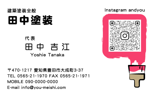 ペンキ屋・塗装屋 名刺デザイン penki-CA-002 カテゴリ > ペンキ屋・塗装屋 名刺デザイン ペンキが塗られた部分にQRコードを記載するペンキ屋・塗装屋さん向けの名刺デザインです。 表 イメージ ※オンマウスで拡大表示いたします。 サイズ 91mm × 55mm このデザインで注文する このデザインでFAX注文 裏面デザインについて このデザインをお気に入りに追加 この商品に対するお問い合わせ 色違いデザイン penki-CA-001 簡単料金計算 用紙を選択 ハイトーン (最もスタンダードな白い用紙) マイルド (白味を少し抑えたオフホワイトの用紙) サニー (クリーム色の用紙) グレイ (緑がかった明るい灰色の用紙) 光沢紙 ※両面印刷不可 ※ラインストーン不可半透明(トレーシングペーパー) ※両面印刷不可 ※ラインストーン不可半透明(NTパイル) ※両面印刷不可 ※ラインストーン不可厚紙:オフホワイト 枚数を選択 203050100150200300400500 金額をチェック 送料はこちら レビューコメント レビュー・コメントはまだありません。 閉じる レビューをお書きください このデザインのレビュー(ご感想)をぜひご記入ください レビュー入力欄 レビューは不特定多数の方がご覧になりますので、 個人情報などを含まれないようにご注意ください。 投稿していただいた内容について、弊社で不適切と判断した場合には、 お断りなく非掲載とさせていただく場合がございます。 レビュー記入者の種別 閲覧者 購入者 レビュー記入者の名前(ニックネーム) 下の数字を入力: