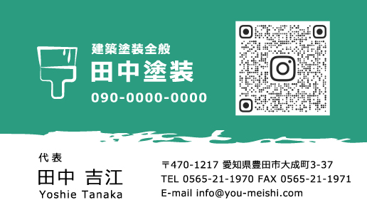 ペンキ屋・塗装屋 名刺デザイン penki-CA-005 カテゴリ > ペンキ屋・塗装屋 名刺デザイン ハケのイラストが描かれたペンキ屋・塗装屋さん向けの名刺デザインです。QRコードを大きめに配置しています。 表 イメージ ※オンマウスで拡大表示いたします。 サイズ 91mm × 55mm このデザインで注文する このデザインでFAX注文 裏面デザインについて このデザインをお気に入りに追加 この商品に対するお問い合わせ 色違いデザイン penki-CA-006 簡単料金計算 用紙を選択 ハイトーン (最もスタンダードな白い用紙) 光沢紙 ※両面印刷不可 ※ラインストーン不可半透明(トレーシングペーパー) ※両面印刷不可 ※ラインストーン不可半透明(NTパイル) ※両面印刷不可 ※ラインストーン不可 枚数を選択 203050100150200300400500 金額をチェック 送料はこちら レビューコメント レビュー・コメントはまだありません。 閉じる レビューをお書きください このデザインのレビュー(ご感想)をぜひご記入ください レビュー入力欄 レビューは不特定多数の方がご覧になりますので、 個人情報などを含まれないようにご注意ください。 投稿していただいた内容について、弊社で不適切と判断した場合には、 お断りなく非掲載とさせていただく場合がございます。 レビュー記入者の種別 閲覧者 購入者 レビュー記入者の名前(ニックネーム) 下の数字を入力: