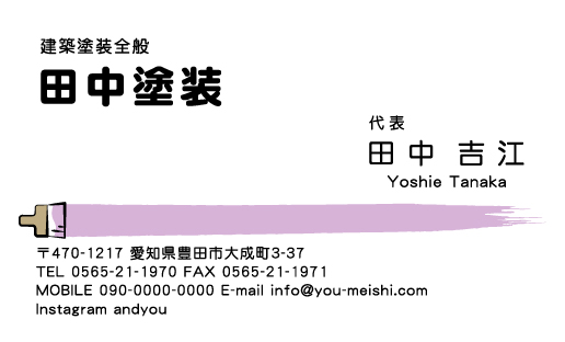 ペンキ屋・塗装屋 名刺デザイン penki-CA-007 カテゴリ > ペンキ屋・塗装屋 名刺デザイン ハケのイラストが描かれたペンキ屋・塗装屋さん向けの名刺デザインです。 表 イメージ ※オンマウスで拡大表示いたします。 サイズ 91mm × 55mm このデザインで注文する このデザインでFAX注文 裏面デザインについて このデザインをお気に入りに追加 この商品に対するお問い合わせ 色違いデザイン penki-CA-008 簡単料金計算 用紙を選択 ハイトーン (最もスタンダードな白い用紙) マイルド (白味を少し抑えたオフホワイトの用紙) サニー (クリーム色の用紙) グレイ (緑がかった明るい灰色の用紙) 光沢紙 ※両面印刷不可 ※ラインストーン不可和紙(両面新大礼紙) (両面にレーヨン繊維が漉き込まれています) 半透明(トレーシングペーパー) ※両面印刷不可 ※ラインストーン不可半透明(NTパイル) ※両面印刷不可 ※ラインストーン不可厚紙:オフホワイト 枚数を選択 203050100150200300400500 金額をチェック 送料はこちら レビューコメント レビュー・コメントはまだありません。 閉じる レビューをお書きください このデザインのレビュー(ご感想)をぜひご記入ください レビュー入力欄 レビューは不特定多数の方がご覧になりますので、 個人情報などを含まれないようにご注意ください。 投稿していただいた内容について、弊社で不適切と判断した場合には、 お断りなく非掲載とさせていただく場合がございます。 レビュー記入者の種別 閲覧者 購入者 レビュー記入者の名前(ニックネーム) 下の数字を入力: