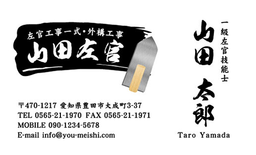 左官屋・左官業 sakanya-NI-024 カテゴリ > 左官屋・左官業 名刺デザイン 左官鏝を名刺にデザインしました。 表 イメージ ※オンマウスで拡大表示いたします。 サイズ 91mm × 55mm このデザインで注文する このデザインでFAX注文 裏面デザインについて このデザインをお気に入りに追加 この商品に対するお問い合わせ 色違いデザイン sakanya-NI-025 簡単料金計算 用紙を選択 ハイトーン (最もスタンダードな白い用紙) 光沢紙 ※両面印刷不可 ※ラインストーン不可 枚数を選択 203050100150200300400500 金額をチェック 送料はこちら レビューコメント レビュー・コメントはまだありません。 閉じる レビューをお書きください このデザインのレビュー(ご感想)をぜひご記入ください レビュー入力欄 レビューは不特定多数の方がご覧になりますので、 個人情報などを含まれないようにご注意ください。 投稿していただいた内容について、弊社で不適切と判断した場合には、 お断りなく非掲載とさせていただく場合がございます。 レビュー記入者の種別 閲覧者 購入者 レビュー記入者の名前(ニックネーム) 下の数字を入力: