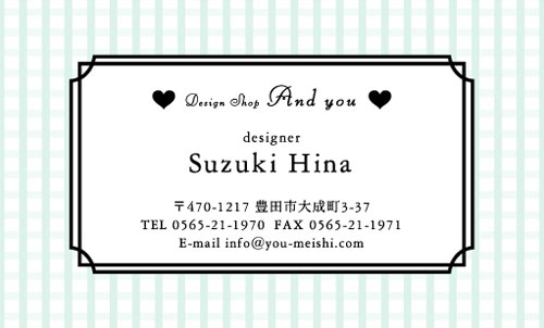 かわいい名刺 YH-CU-086 カテゴリ > かわいいデザイン名刺 表 ※オンマウスで拡大表示いたします。 サイズ 91mm × 55mm このデザインで注文する このデザインでFAX注文 裏面デザインについて このデザインをお気に入りに追加 この商品に対するお問い合わせ 色違いデザイン YH-CU-087YH-CU-088 簡単料金計算 用紙を選択 ハイトーン (最もスタンダードな白い用紙) マイルド (白味を少し抑えたオフホワイトの用紙) サニー (クリーム色の用紙) 光沢紙 ※両面印刷不可 ※ラインストーン不可厚紙:オフホワイト 枚数を選択 203050100150200300400500 金額をチェック 送料はこちら レビューコメント レビュー・コメントはまだありません。 閉じる レビューをお書きください このデザインのレビュー(ご感想)をぜひご記入ください レビュー入力欄 レビューは不特定多数の方がご覧になりますので、 個人情報などを含まれないようにご注意ください。 投稿していただいた内容について、弊社で不適切と判断した場合には、 お断りなく非掲載とさせていただく場合がございます。 レビュー記入者の種別 閲覧者 購入者 レビュー記入者の名前(ニックネーム) 下の数字を入力: 関連デザイン penki-ay001 penki-ay002 penki-ay003 penki-ay004 penki-ay005 penki-ay006 aice041 ayce008 ayce009 nice059 nice090 nice091
