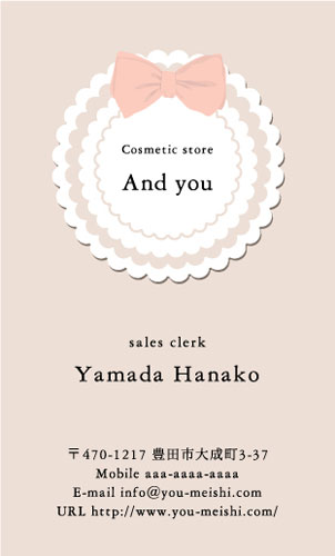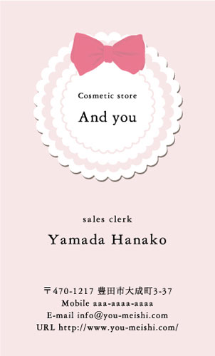 かわいい名刺 YH-CU-093 カテゴリ > かわいいデザイン名刺 表 ※オンマウスで拡大表示いたします。 サイズ 91mm × 55mm このデザインで注文する このデザインでFAX注文 裏面デザインについて このデザインをお気に入りに追加 この商品に対するお問い合わせ 色違いデザイン YH-CU-092YH-CU-094 簡単料金計算 用紙を選択 ハイトーン (最もスタンダードな白い用紙) マイルド (白味を少し抑えたオフホワイトの用紙) サニー (クリーム色の用紙) 光沢紙 ※両面印刷不可 ※ラインストーン不可半透明(トレーシングペーパー) ※両面印刷不可 ※ラインストーン不可半透明(NTパイル) ※両面印刷不可 ※ラインストーン不可 枚数を選択 203050100150200300400500 金額をチェック 送料はこちら レビューコメント 2 件のレビュー・コメントがあります。 ほのは 様(閲覧者) 2023年05月22日 わお!可愛い!レースが本物みたい。背景の色が薄いブルーでめちゃめち... 続きを読む ほのは 様(閲覧者) 2023年05月22日 わお!可愛い!レースが本物みたい。背景の色が薄いブルーでめちゃめちゃ清楚感。この名刺を持っていそうな女子が想像できそうな、とってもプリティな名刺だなと思いました。可愛い!! あやめ 様(閲覧者) 2018年09月01日 丸いレースと黄色のリボン可愛いデザインですね。それに水色と黄色の組み合わせも好きです☆ポーセラーツ教室を開いているので、生徒さんにお渡しする名刺をと考えています。このデザインが今一番の候補ですが、他にも色々な可愛いデザインがあるので、じっくり検討させていただきますね。 閉じる レビューをお書きください このデザインのレビュー(ご感想)をぜひご記入ください レビュー入力欄 レビューは不特定多数の方がご覧になりますので、 個人情報などを含まれないようにご注意ください。 投稿していただいた内容について、弊社で不適切と判断した場合には、 お断りなく非掲載とさせていただく場合がございます。 レビュー記入者の種別 閲覧者 購入者 レビュー記入者の名前(ニックネーム) 下の数字を入力: 関連デザイン penki-ay001 penki-ay002 penki-ay003 penki-ay004 penki-ay005 penki-ay006 ayl027 ayl029 ayl030 ayl038 nigi009 nigi010