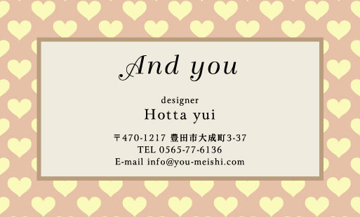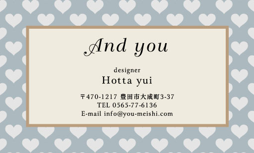 柄物デザイン名刺 YH-GA-014 カテゴリ > 柄物デザイン名刺 表 ※オンマウスで拡大表示いたします。 サイズ 91mm × 55mm このデザインで注文する このデザインでFAX注文 裏面デザインについて このデザインをお気に入りに追加 この商品に対するお問い合わせ 色違いデザイン YH-GA-013YH-GA-015 簡単料金計算 用紙を選択 ハイトーン (最もスタンダードな白い用紙) マイルド (白味を少し抑えたオフホワイトの用紙) サニー (クリーム色の用紙) 光沢紙 ※両面印刷不可 ※ラインストーン不可半透明(トレーシングペーパー) ※両面印刷不可 ※ラインストーン不可半透明(NTパイル) ※両面印刷不可 ※ラインストーン不可 枚数を選択 203050100150200300400500 金額をチェック 送料はこちら レビューコメント 1 件のレビュー・コメントがあります。 パープルン 様(閲覧者) 2022年02月11日 ハートが背景に散りばめられていて可愛らしいですね。パープルとピンク... 続きを読む パープルン 様(閲覧者) 2022年02月11日 ハートが背景に散りばめられていて可愛らしいですね。パープルとピンクで大人可愛い色味になっているのが幅広く持ちやすそうって思いました!中のゴールドで縁とっている文字のところが、黒色で筆記体と普通の文字が合わさっているからすごくおしゃれ。 閉じる レビューをお書きください このデザインのレビュー(ご感想)をぜひご記入ください レビュー入力欄 レビューは不特定多数の方がご覧になりますので、 個人情報などを含まれないようにご注意ください。 投稿していただいた内容について、弊社で不適切と判断した場合には、 お断りなく非掲載とさせていただく場合がございます。 レビュー記入者の種別 閲覧者 購入者 レビュー記入者の名前(ニックネーム) 下の数字を入力: 関連デザイン ktcu011 nikd126 nikd184 nikd187 stcu009 stcu021 stcu022 yhcu001 yhcu084 yhcu087 akce048 akce049
