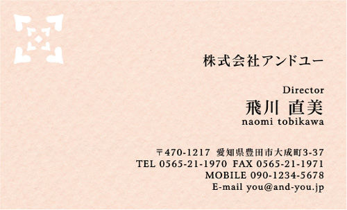 エンボス調の用紙を使っていて、全体的に柔らかな雰囲気を感じさせるデザインです。 隅に型抜かれたレースのワンポイントが可愛らしくて、とても女性的な雰囲気を感じさせます。 使用されている書体は、堅いゴシック調なので柔らか過ぎず、全体的に甘過ぎない仕上がりになっているので、ビジネスでも活躍しそうな1枚ですね。 とても使いやすそうな名刺デザインで良いです。 | |