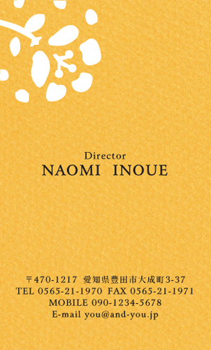 綺麗で優雅な名刺ですね。 暖色でまとめられたデザインは、暖かみを感じさせてくれ、気分をほっこりとさせてくれます。 花の美しさと、朝焼け・夕焼けを思わせる背景は情緒あふれる雰囲気で、貰った人の心を落ち着かせてくれるでしょう。 文字のフォントも筆文字を使い、和風の装飾として一体感を持たせています。 名刺の方向も縦向きで、その意味でも和風であります。 | |
