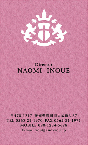モノトーンにパッションピンクが入ることによってスポーティーな名刺になってますね。 某スポーツメーカーのウエアみたいですね(笑)名前のローマ字の部分をカクカクした文体にしているので、そう見えちゃうのかな?情報の下にパッションピンクの下線が入ることによって引き締まった感じが良いです。 ビジネスではもちろん、プライベートにも使えるデザインが素敵ですね♪ | |