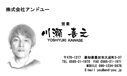 白を基調に、役職と姓名を中央に配置し、左下に似顔絵を挿入した名刺です。 厳しいビジネス社会において、競合他社と差別化をはかる為、似顔絵を利用し、商談を有利にする戦略ですね。 普通のビジネス名刺なら、似顔絵なんか挿入していませんよね。 しかし、あえて、似顔絵を挿入して異端児を演出することで、厳しい商談の場をなごやかにする効果がありますよね。 | |
