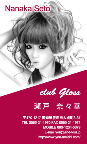 ピンクが女の子らしいですね! ! バックの淡いピンクにレースっぽい花や丸が散りばめられられててカワイイ~! ! 真ん中のハートが、ぼかした感じにしているので濃い色なのに柔らかい感じがしますね♪ 文字もハートが濃い色なので「白文字」が映えてイイですね! 文字体は筆記体で書かれていてオシャレすぎます! ! こんな名刺欲しいですね! ! | |