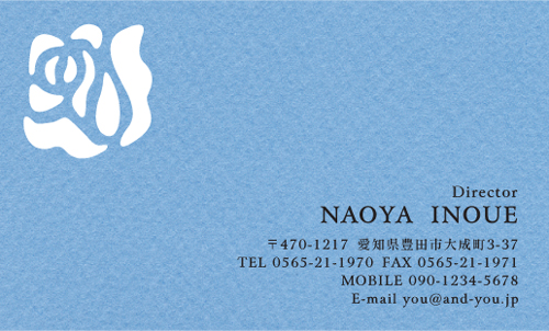 すごくきれいなブルーですね! ! クールで爽やかな感じのイメージがします! ! 用紙自体にデコボコがあるので触り心地が良さそうですね♪ 私がもらったら、ずっと触っていたくなります(笑)名前をローマ字のみでカッコ良くて文字色を黒に統一しているのでスッキリ見えてイイ! ! なんといってもバラのような切り抜きが「女性らしさ」を感じます! ! | |