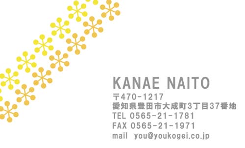 シンプルなデザインのなかに、黄色の差し色でアクセントが施された、とても可愛い雰囲気の名刺ですね。 基本がシンプルなデザインなので使いやすそうでとても良いです。 名前や住所などの情報欄が文字が少し大きめで読みやすく、書体もちょっと柔らかめで可愛らしさをアップしているような気がします。 ビジネスでもプライベートでも使いやすい1枚だと思います。 | |