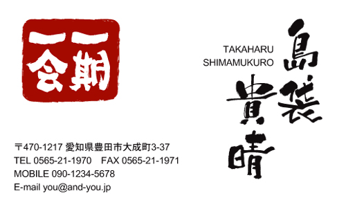 白色を下地に、和の風格と伝統と格式を強調するために、筆文字でちょっと大きめに姓名を縦書きで描いた和紙名刺です。 さらに、インパクトをお客様に与えて、名前を覚えてもらうために、一期一会という四字熟語を描くことで、一度の出会いを大切に、お客様に接し、顧客満足度を高めているように見えますね。 名前を覚えてもらいたいビジネスパーソンには必見ですよ。 | |