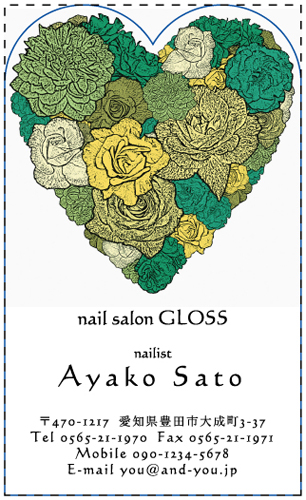 主にグリーン系の色で花が名刺がある事で、この名刺のお店が落ち着きのあり、リラックスが出来て、リフレッシュ出来そうなイメージが湧いてきちゃいます。 それだけじゃなくハート型になっているのが女らしさがあり可愛くてエレガントさも忘れていなのが、とってもイイ。 後、店の名前とか上品さがあるタッチの字なので知的な色気もあってお洒落でイイです。 | |